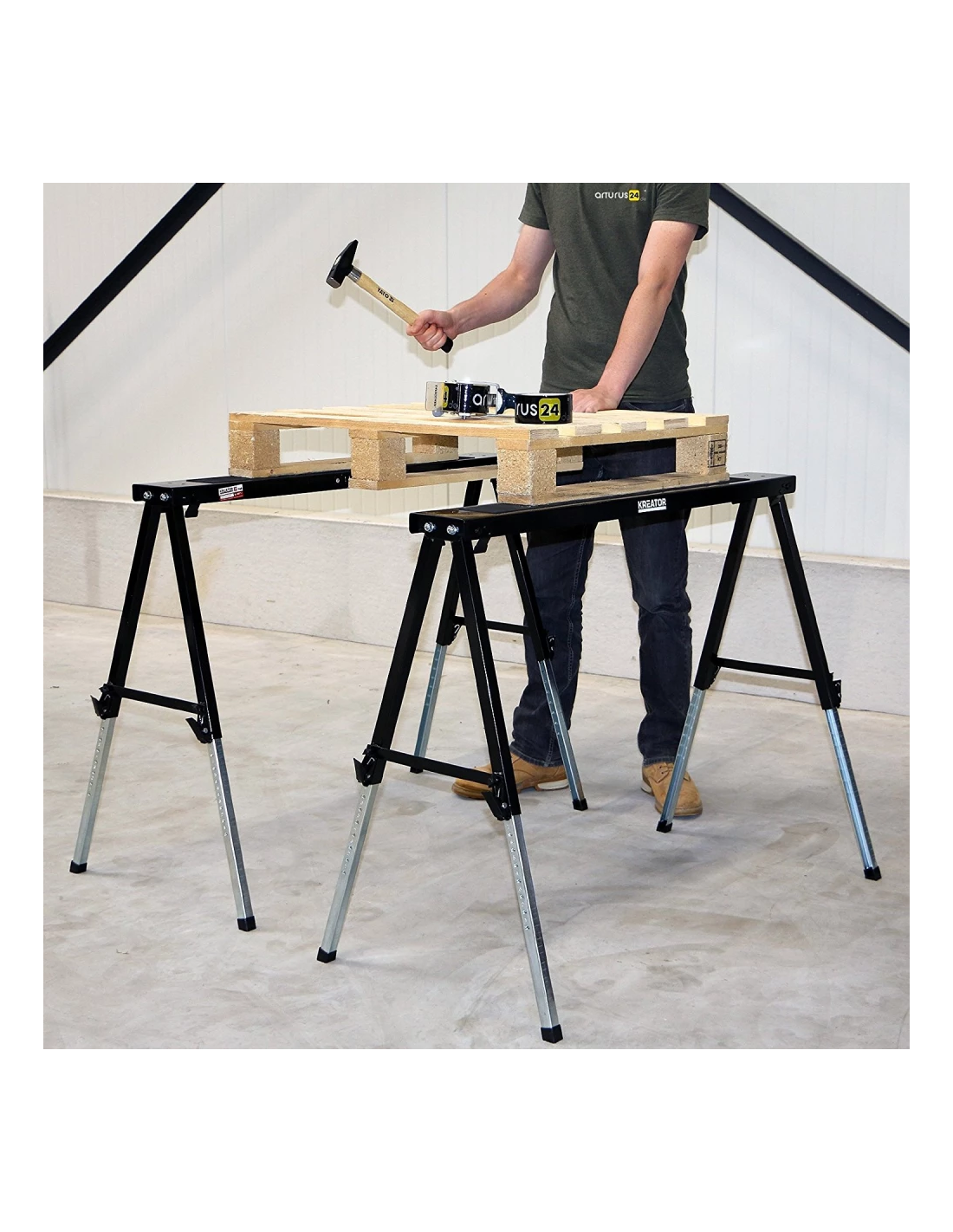 Denne arbejdsbuk er designet med praktisk tilpasning for øje og giver dig mulighed for at tilpasse dens højde perfekt til dit arbejdsbord. Justeringen spænder fra 64,5 cm til 91 cm, hvilket gør det let at matche højden på arbejdsbordet og dermed skabe en bekvem arbejdssituation. Dette gør det også muligt for bukken at rumme større genstande med en imponerende vægtkapacitet på op til 150 kg.