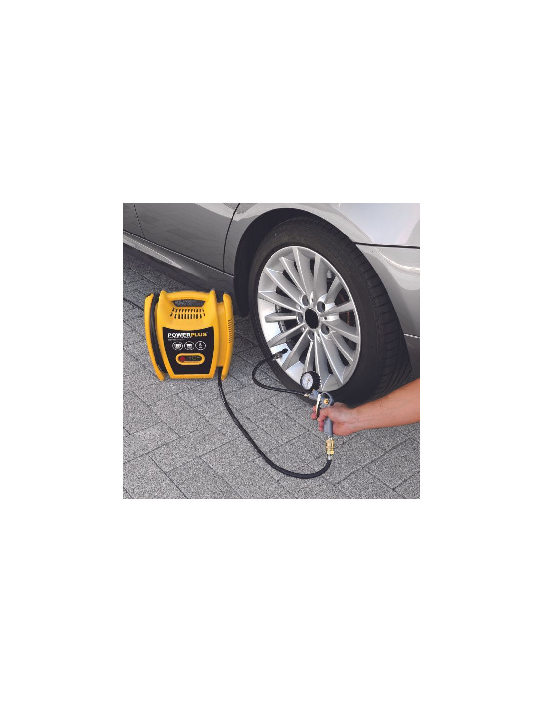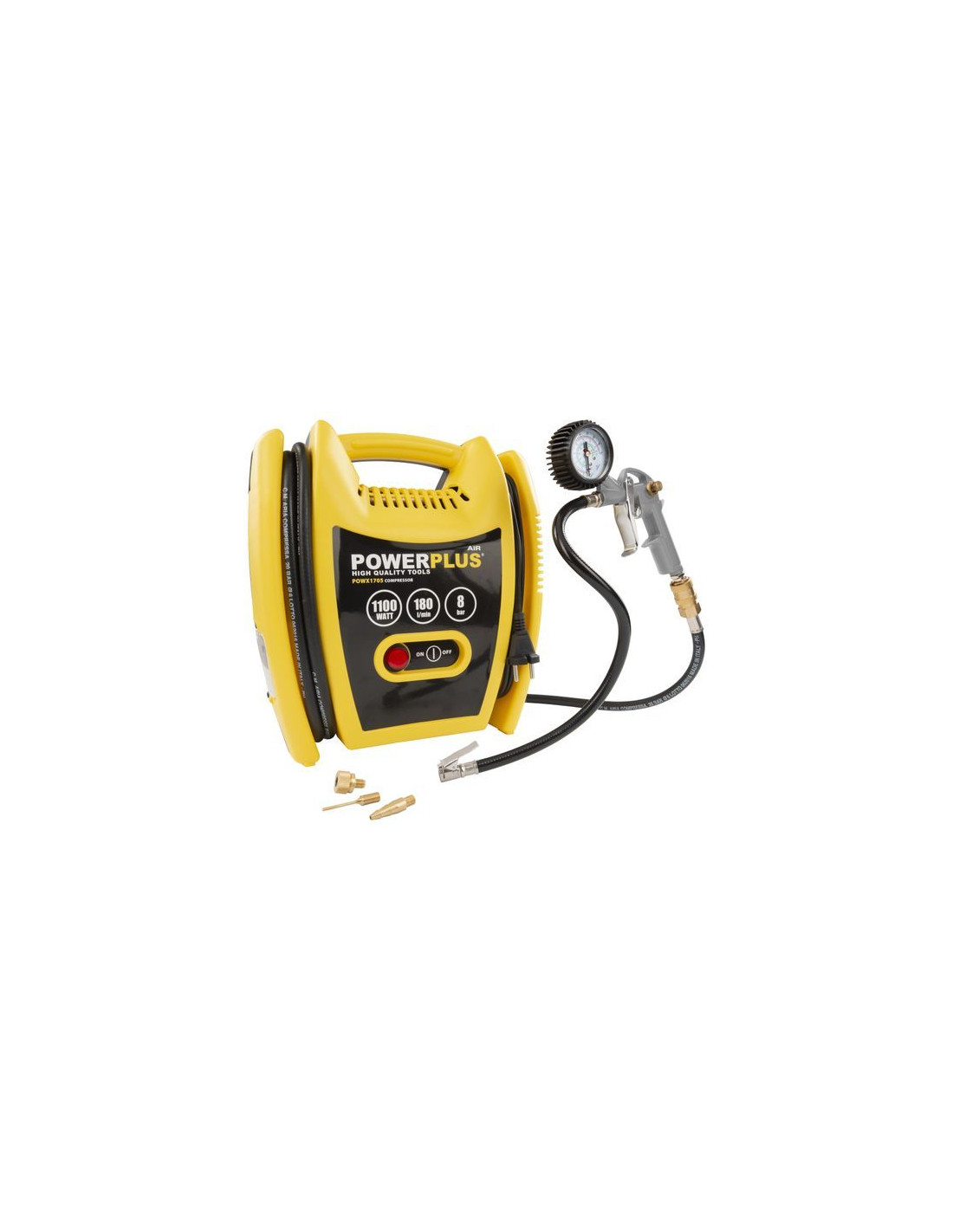 Denne POWX1705 kompressor har 5 deles tilbehør: en 3 meter gummislange, en blæsepistol og 3 adapter til oppustning af bolde, cykler og madrasser. Et praktisk værktøj til alle de små job, der kræver trykluft.