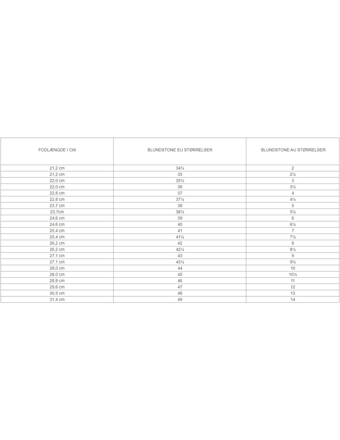 Bemærk: Blundstone støvler og sko er mærket med australsk / Storbritannien størrelse. Blundstone 1/2 størrelser refererer kun til bredden, ikke længden.