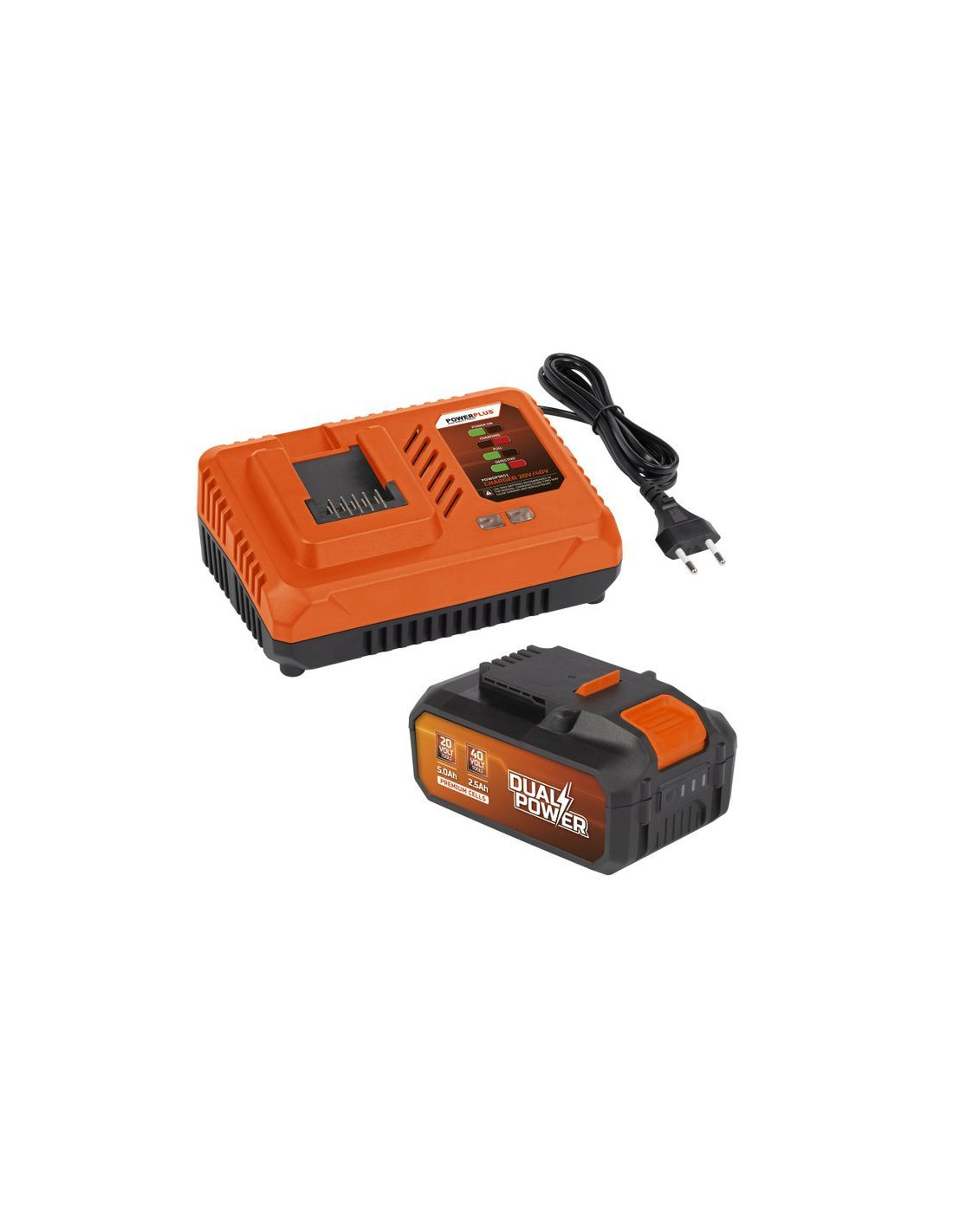 Denne teleskop kædesav leveres med et 40V Dual Power-batteri og oplader, som også kan bruges til andre værktøjer i Dual Power-serien. Med Dual Power-systemet får du mulighed for at bruge det samme batteri til flere haveredskaber, hvilket sparer penge og tid og giver stor fleksibilitet i havearbejdet.