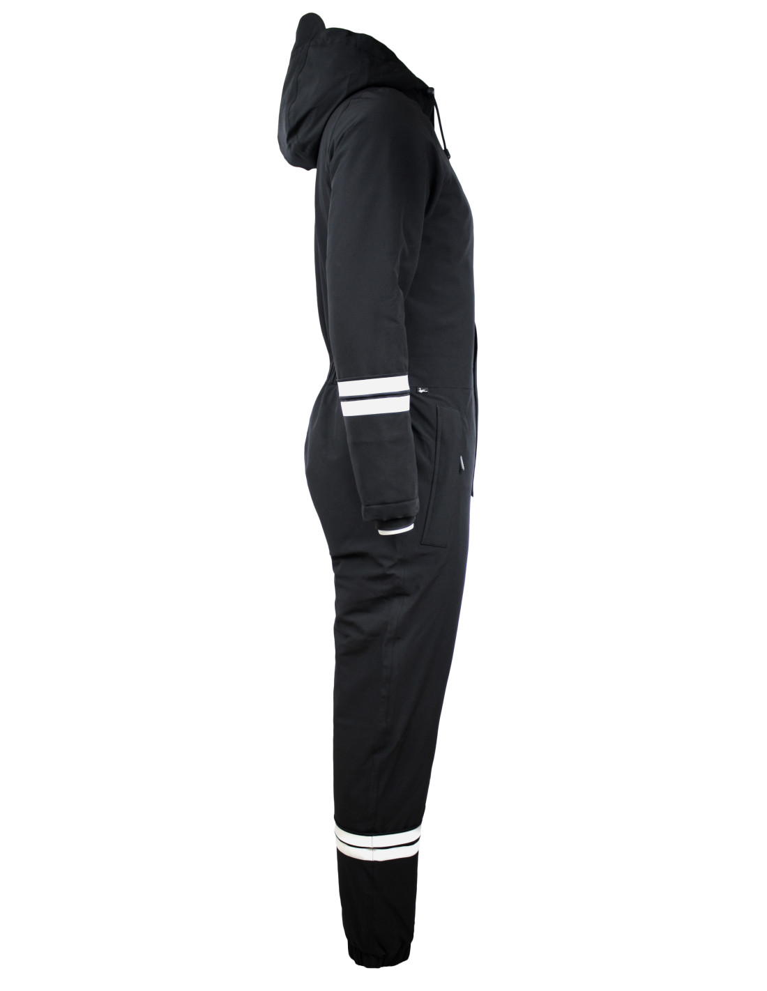 Jumpsuiten har en praktisk fast hætte med snøre, skjult to-vejs lynlås med velcrolukning og elastisk vindfang ved håndleddene, så du forbliver beskyttet mod elementerne. Du kan tilpasse pasformen med snøren i taljen, mens de elastiske ankler og de foldbare reflekser ved ærmer og ben sikrer ekstra komfort og synlighed.