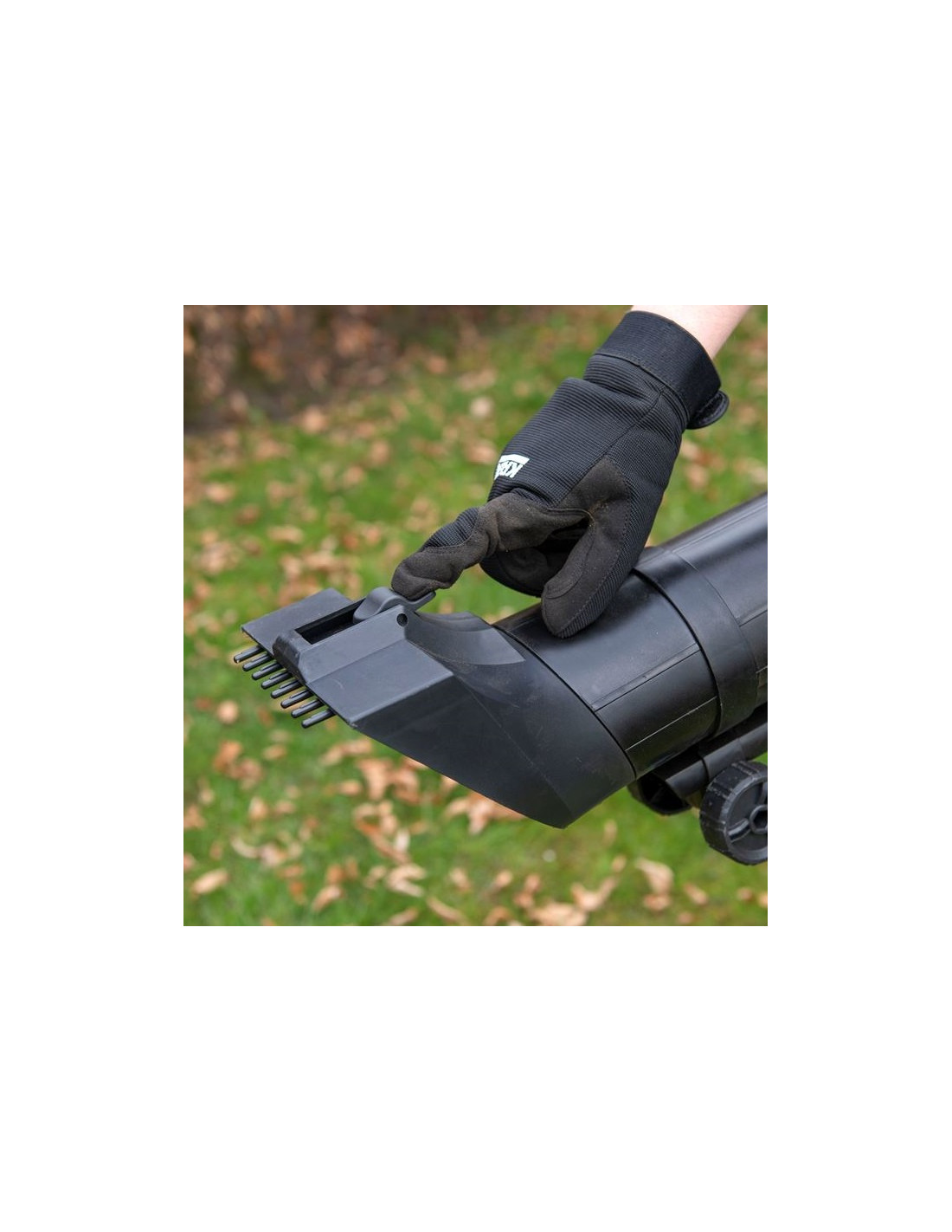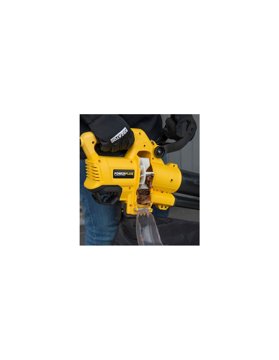 En af de specielle funktioner ved Powerplus Løvblæser/Støvsuger er den indbyggede rive, der gør det nemt at samle og komprimere haveaffald.