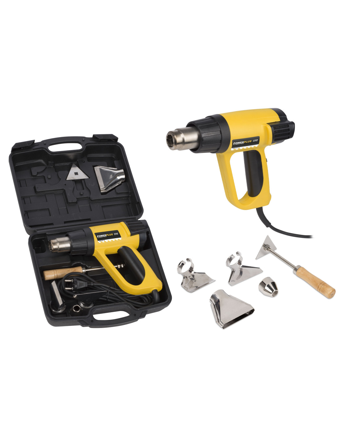 En rustfri stålskraber til fjernelse af maling og lak og 4 forskellige dyser er inkluderet.