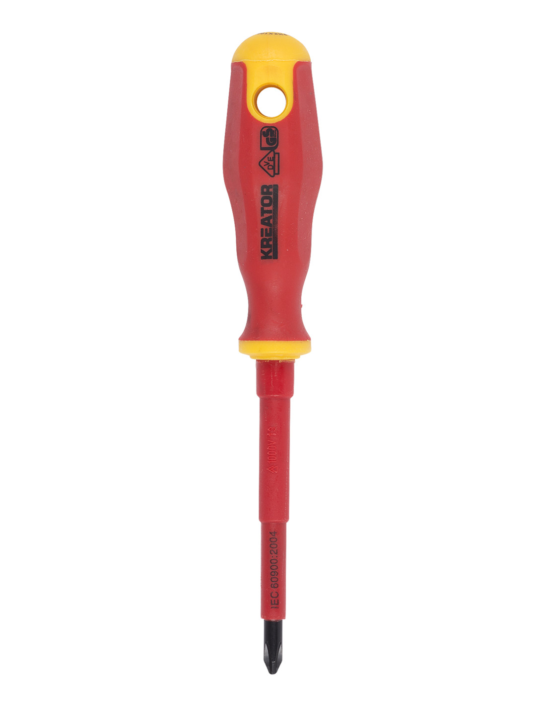 Denne isolerede PH2-skruetrækker fra vores Kreator-serie har et 100 mm langt skaft. Den magnetiske spids fremskynder processen med at skrue skruer. Skruetrækkeren er ideel til alle slags projekter, der involverer elektricitet. For ekstra brugerkomfort er den udstyret med et blødt greb, der har et integreret ophængsøje for nem opbevaring.