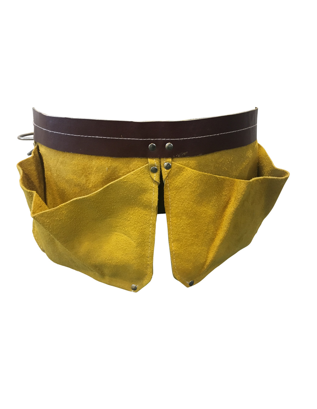Værktøjsbæltet er designet med praktiske funktioner og fremstillet af holdbart brunt læder. Forsiden og bagsiden af bæltet har en hvid kantsyning, der tilføjer et æstetisk element. De to store lommer med metalnitter giver rigelig plads til opbevaring af værktøjer, søm eller andre nødvendigheder under arbejdet.