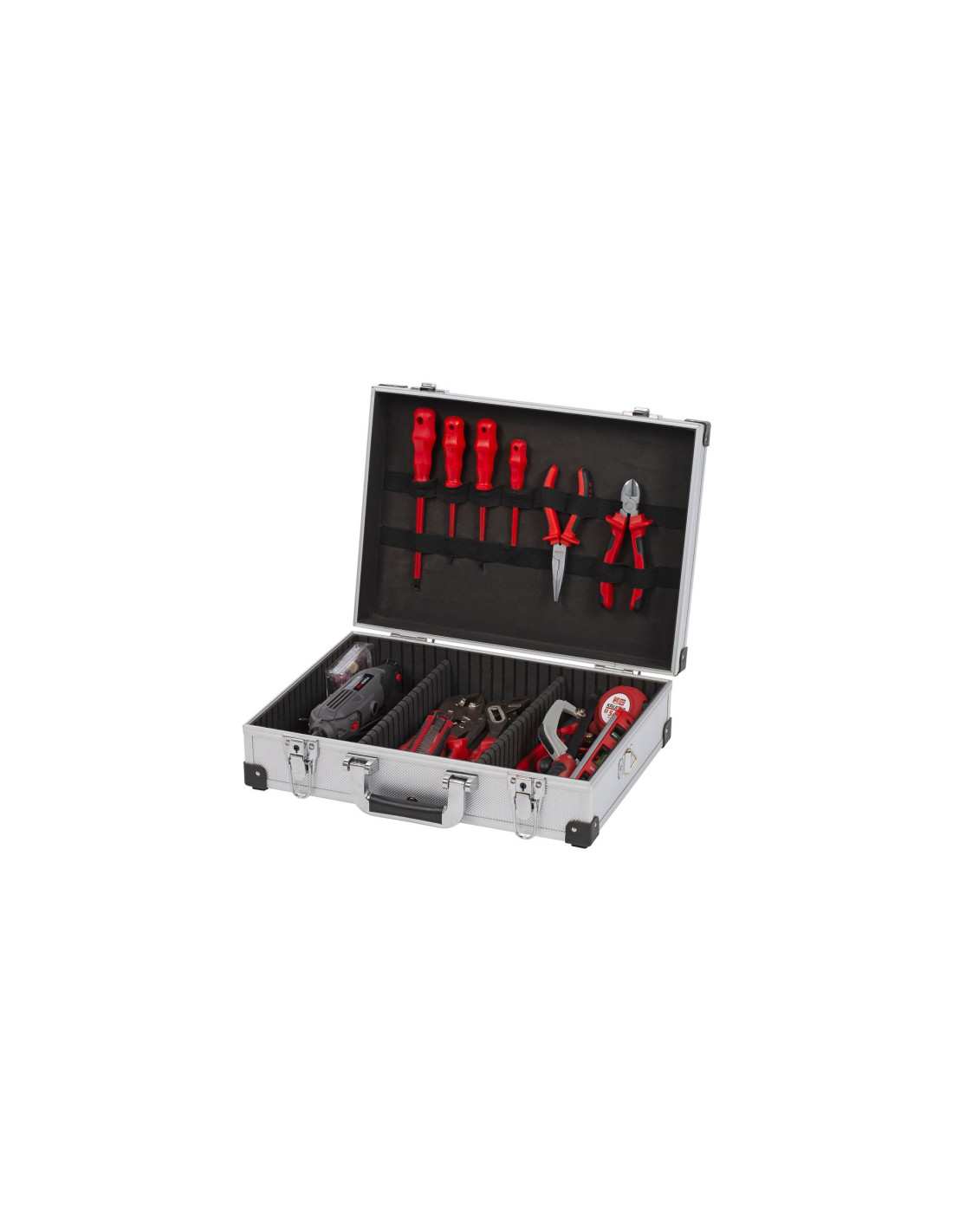 I denne opbevaringsboks med aluminiumsramme fra Kreator kan du holde dine værktøjer adskilt i tre opbevaringsrum. Du kan skifte rum, som du ønsker, og øverst kan du opbevare dit tilbehør stramt bag elastiske stropper.