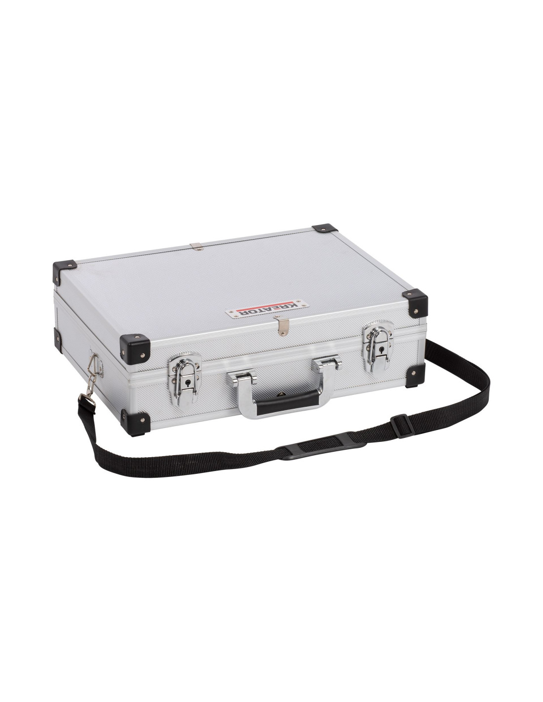 I denne opbevaringsboks med aluminiumsramme fra Kreator kan du holde dine værktøjer adskilt i tre opbevaringsrum. Du kan skifte rum, som du ønsker, og øverst kan du opbevare dit tilbehør stramt bag elastiske stropper.
